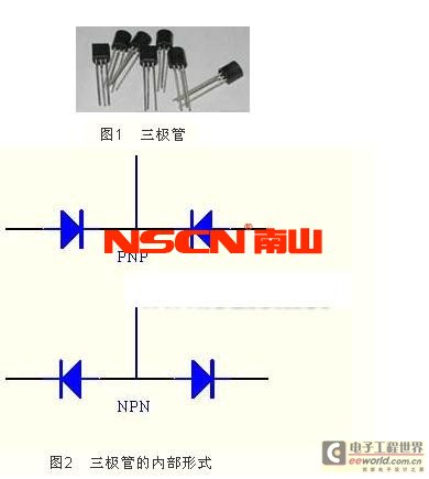 大家知道,三極管是含有兩個PN結的半導體器件。根據(jù)兩個PN結連接方式不同,可以分為NPN型和PNP型兩種不同導電類型的三極管,圖1是它們的電路符號和等效電路。