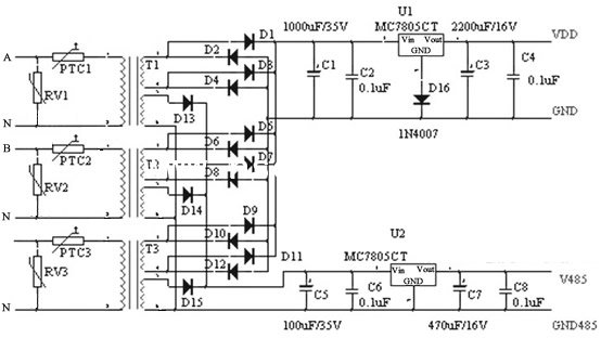 變壓器對各相的電壓進行變壓,然后通過整流穩壓電路對電表供電。